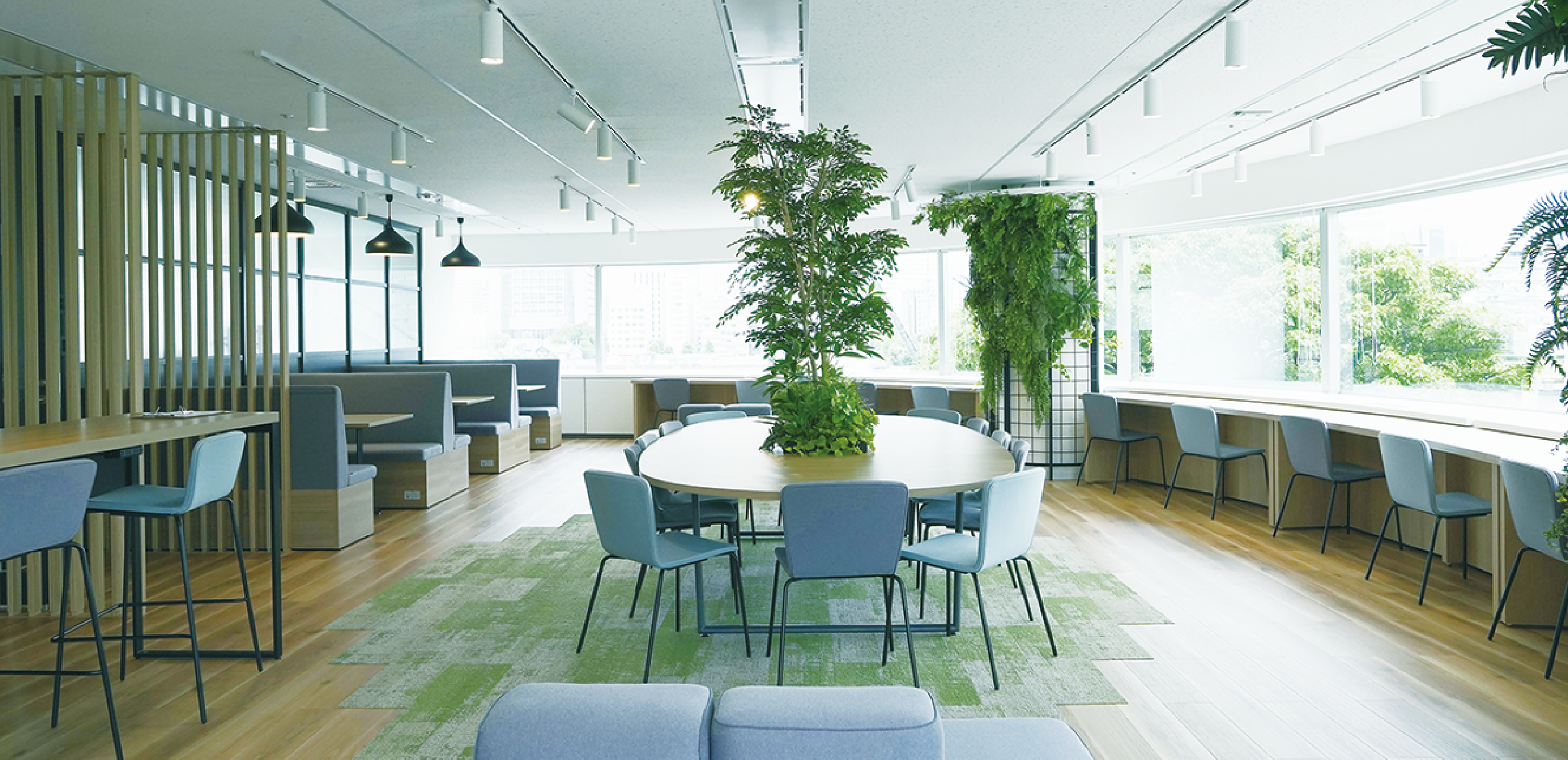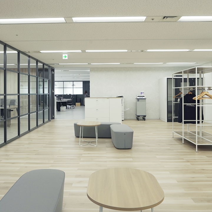社名ロゴが出迎えてくれて、そこから見通しの良い社内を一望することができます。
